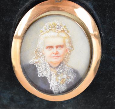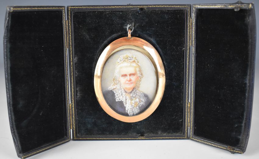 F.E. Bennett portrait miniature on ivory of a lady, titled verso Grannie, signed lower left, maximum diameter 7cm, in gilt frame, in original travel case, with ivory licence