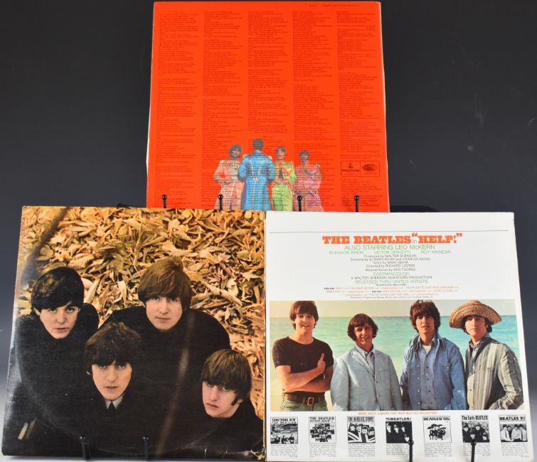 The Beatles - Three LPs comprising Sgt Pepper's Lonely Hearts Club Band (PCS 7027) with 'The Gramophone Co etc' to label perimeter, Garrod and Lofthouse gatefold flip back top edge cover, matrix YEX 637-1 and YEX 638-1 and card insert record appears Ex, Beatles For Sale (PMC 1240) matrix XEX 503-4N and XEX 504N, EMITEX inner and gatefold sleeve, record appears VG+ and Help! Motion Picture Sountrack USA issue (SMAS 2386) with Apple labels, gatefold sleeve and matrix SMAS -1-2386 H21#3 (scratched) Mastered By Capitol (stamped), record appears Ex