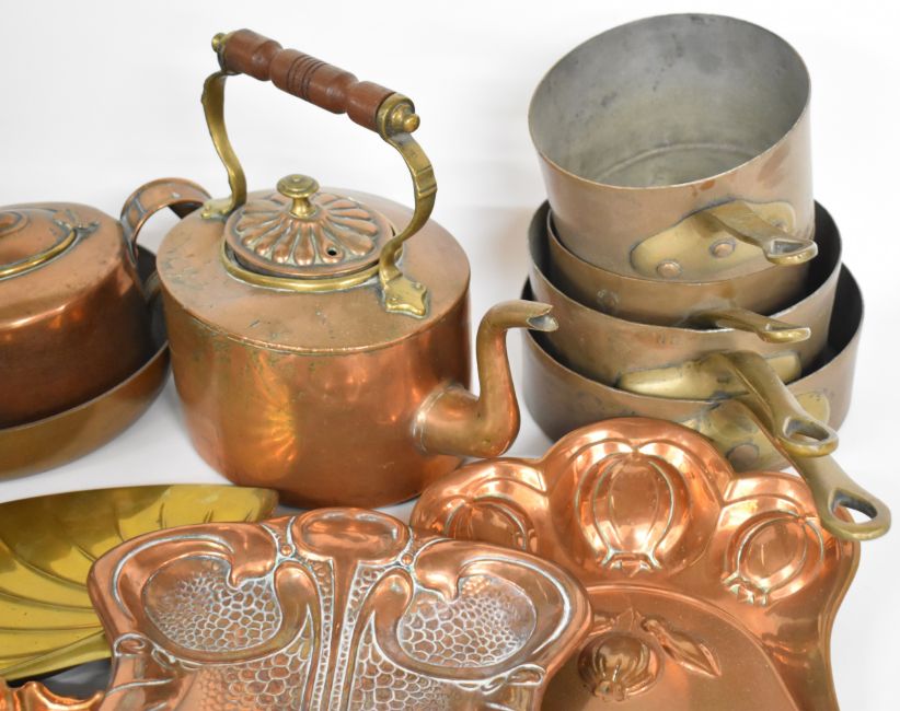 Arts & Crafts / Art Nouveau copper crumb trays, Newlyn style tray with ship and buoy decoration, copper kettles, set of heavy copper pans / saucepans etc, tallest 29cm