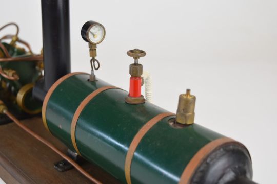 Live steam model marine plant comprising silver soldered copper boiler with cross tubes, safety valve and pressure gauge, to suit gas firing, driving a V4 double acting oscillating engine driving a propellor, overall length 46cm