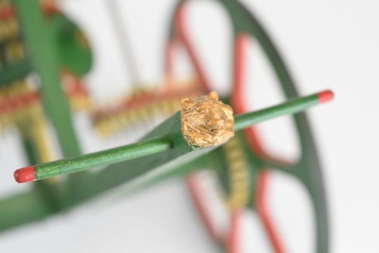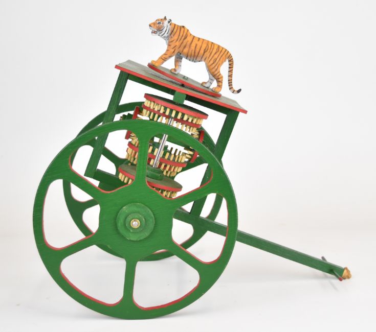 Novelty model of a Chinese carriage surmounted by a tiger on a platform, built by the award winning late Harry Clyne. The tiger driven by gears acting to keep the tiger facing in a single direction when the carriage is turned, length 39cm