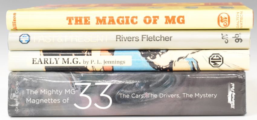 [MG] The Mighty MG Magnettes of 33, The Cars, The Drivers, The Mystery by Graeme Cocks published Australia, Motoring Past 2014 first edition illustrated with colour and black & white photographs, hardback volume in colour dust-wrapper [story of the MG in 1933]. M.G. Past & Present by Rivers Fletcher 1981 SIGNED copy, in dust-wrapper. Early M.G. by Jennings 1989, in dust-wrapper. The Magic of M.G. by Allison 1978, in dust-wrapper (4) Vintage car interest