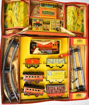 Mettoy tinplate clockwork Combination Passenger Train Set with locomotive, carriages, track, signal, station etc, 5563, in original box.