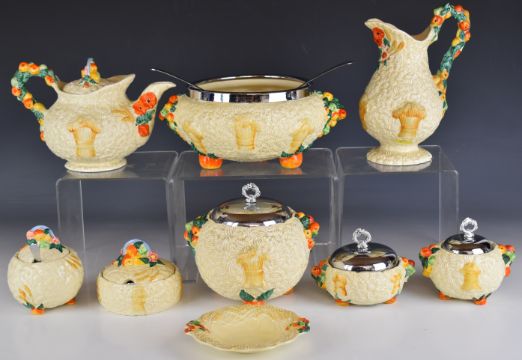 Clarice Cliff collection of Celtic Harvest pattern ceramics including teapot, biscuit barrel, fruit dish etc, tallest 16cm