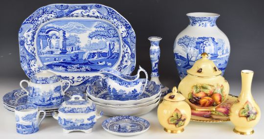 Spode tea, dinner and decorative ware in the Italian pattern including a large vase, meat plate and candlestick, Aynsley Orchard Gold ware etc, tallest 27cm