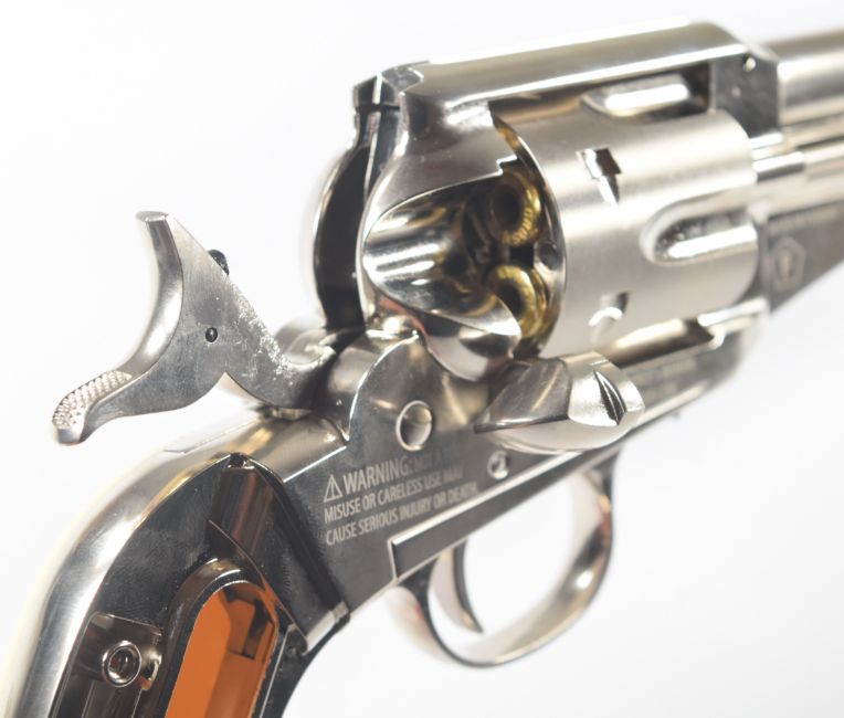 Sheridan Cowboy SRCB .177 air pistol with faux ivory grips and fixed sights, serial number 22M018979, in original box with accessories.  PLEASE NOTE:- Before bidding please ensure that you are fully aware of any law regarding ownership and of any limitations on shipping of this item