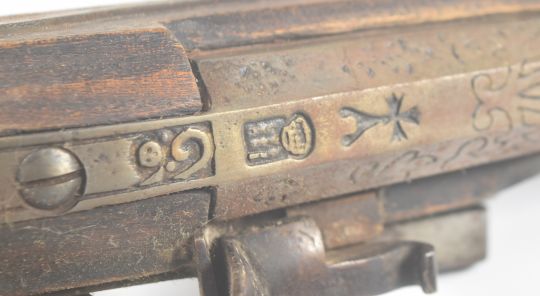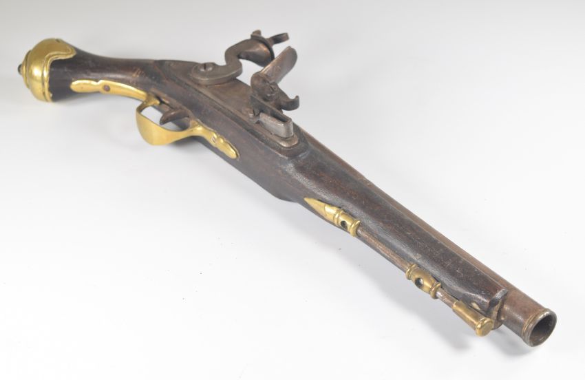Flintlock pistol with lock stamped Brander & Potts London, brass trigger guard and butt plate, brass tipped steel ram-rod and engraved 10 inch part-octagonal smooth bored barrel, overall length 42.5cm.