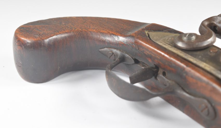Henry Leech of Sligo Ireland flintlock holster pistol with named lock, brass tipped wooden ram-rod and and 8.5 inch smooth bored engraved brass barrel, overall length 36cm