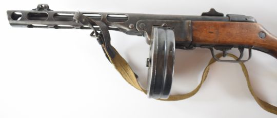 Deactivated Russian PPsh 7.62mm sub machine gun with rotary magazine, canvas sling, adjustable sights and semi-pistol grip, serial number 5930, with deactivation certificate dated 17/03/24.
