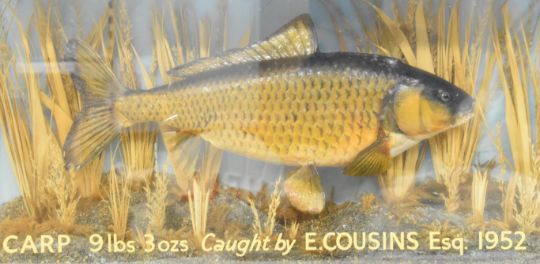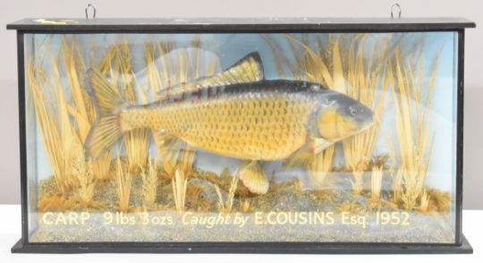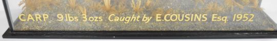 Taxidermy study of a common carp, in glazed case with gilt script 'Carp 9lbs 3oz caught by E Cousins Esq 1952', W85 x D20 x H44