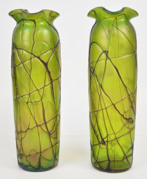 A pair of Kralik iridescent glass vases with trailed decoration over a green ground, 39cm tall.