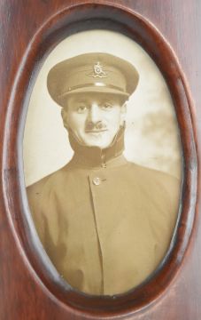 Three WW1 postcard photographs in propeller end shaped frames, two for Royal Flying Corps personnel marked October 14 1917 and 221966 Peak respectively to reverse of pictures and the third with a Royal Artillery officer Lt Walter Hurstbourne