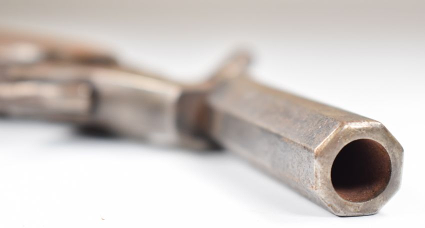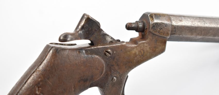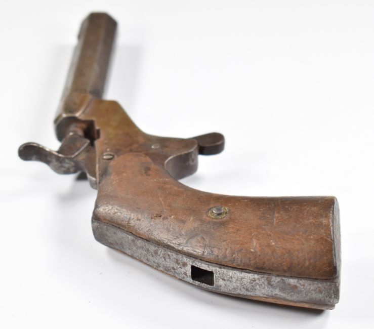 Bootleg style 80 bore percussion hammer action pocket pistol with shaped wooden grips, hole for rifle stock attachment and 2.75 inch smooth bored barrel, overall length 18cm.