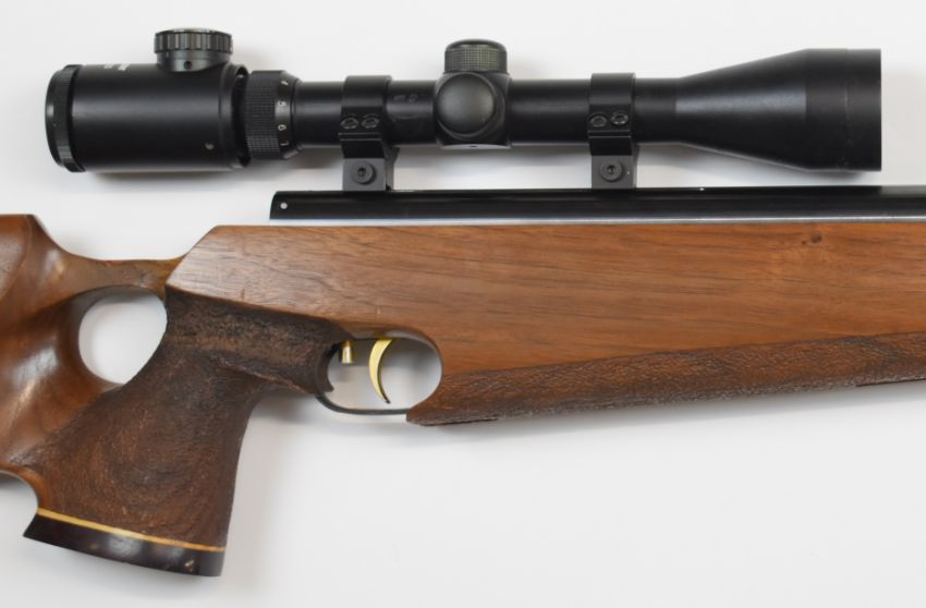 Weihrauch HW95 .177 air rifle with textured thumb-hole grip, raised cheek piece, adjustable gilt trigger, Bushmaster 3-9x40 GD scope and sound moderator, serial number 2347088.  PLEASE NOTE:- Before bidding please ensure that you are fully aware of any law regarding ownership and of any limitations on shipping of this item