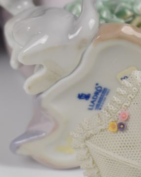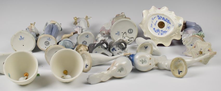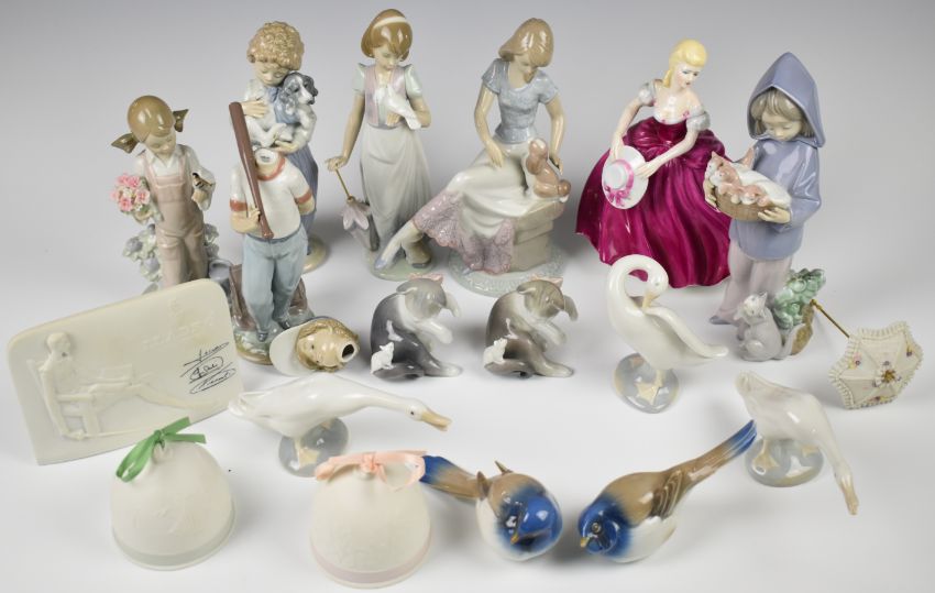 Sixteen Lladro / Nao, Coalport and Bing & Grondahl figures including birds, girls with puppies / parasol and signs including Collector's Society, tallest 22cm
