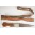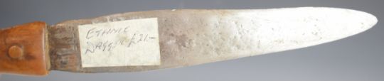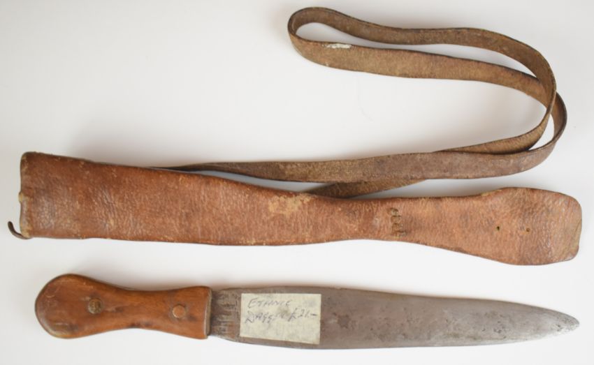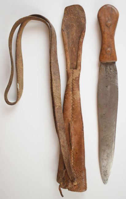 Hunting knife of crude construction, with 23cm double edged blade, wooden grip fixed with bronze rivets, leather scabbard and carry strap PLEASE NOTE:- Before bidding please ensure that you are fully aware of any law regarding ownership and of any limitations on shipping of this item