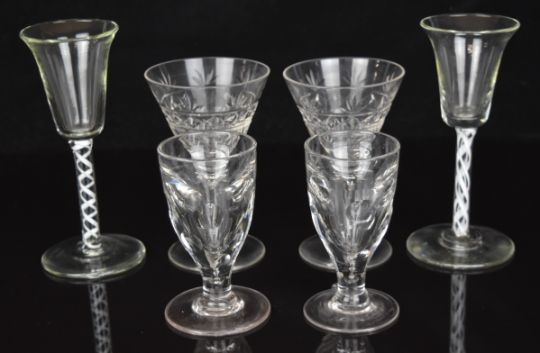 Six various drinking glasses comprising two with twist stems and four with cut decoration, largest 17cm tall.