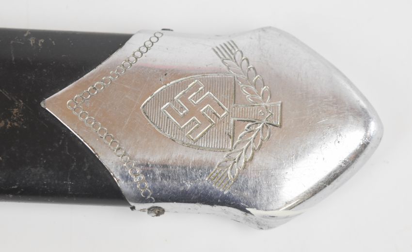 WW2 German Nazi Third Reich RAD hewer with stag horn or similar grips, Arbeit Adelt and maker's marks to 24.5cm blade and scabbard PLEASE NOTE:- Before bidding please ensure that you are fully aware of any law regarding ownership and of any limitations on shipping of this item