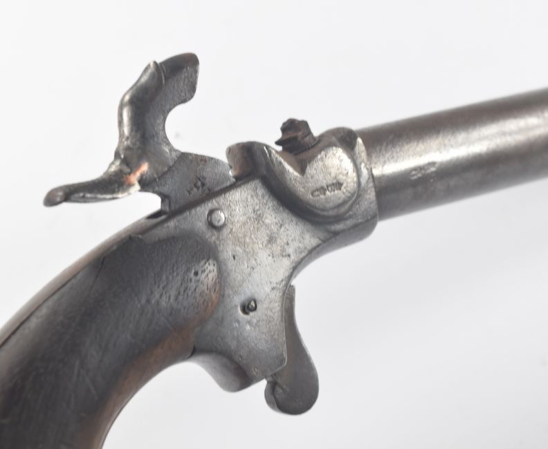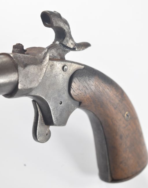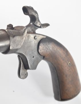 Unnamed 20 bore percussion hammer action bootleg 'man stopper' pistol with wooden grips and 6 inch smooth-bored barrel, overall length 28.5cm.