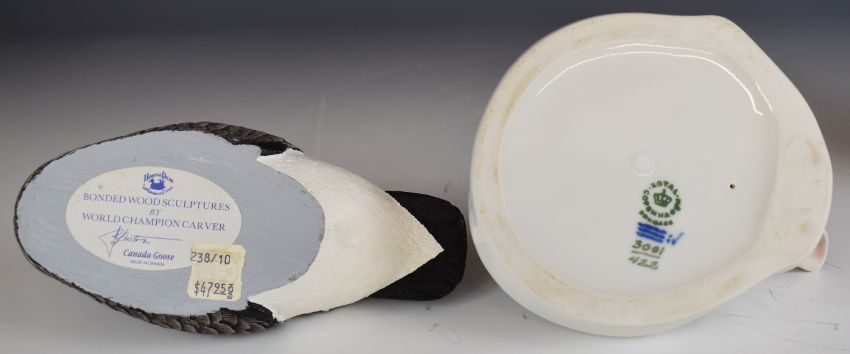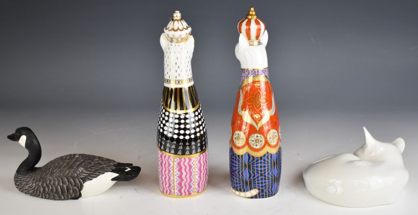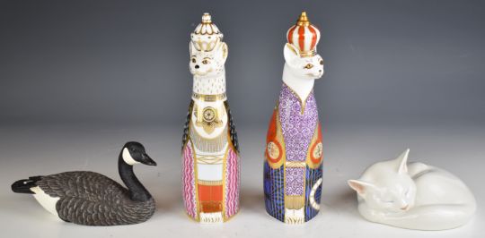 Pair of Royal Crown Derby 'Royal Cats' paperweights, Copenhagen cat and a wood carving of a Canada goose, tallest 22cm