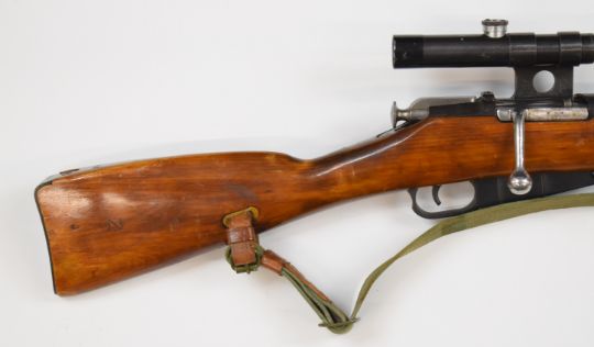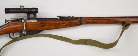 Russian Mosin-Nagant 7.62mm bolt-action rifle with telescopic scope marked '91/30 No. A-108853', adjustable sights, breech stamped with and arrow in star and 1942, canvas and leather sling and 30 inch barrel, overall length 122.5cm, serial number NE824, with Certificate of Proof from the Birmingham Proof House dated 2006. PLEASE NOTE THAT A VALID RELEVANT FIREARMS/SHOTGUN CERTIFICATE IS REQUIRED TO HANDLE/PURCHASE THIS ITEM.