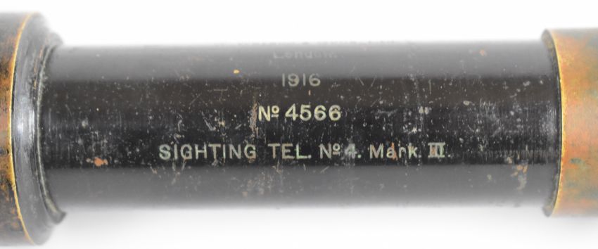 W Watson & Sons Ltd No.4 Mk.III WW1 military sighting scope marked 'W. Watson & Sons Ltd London 1916 No 4566 Sighting Tel No 4 Mark III' below ministry broad arrow, with leather lens covers, 43cm long.