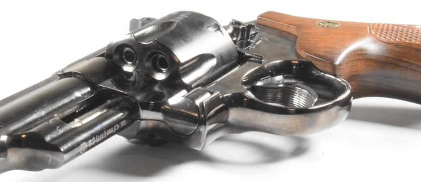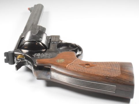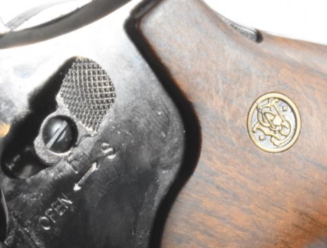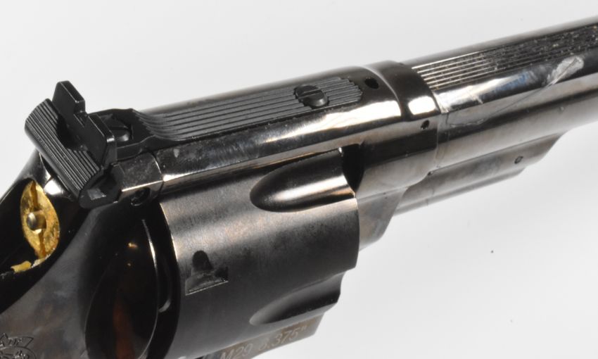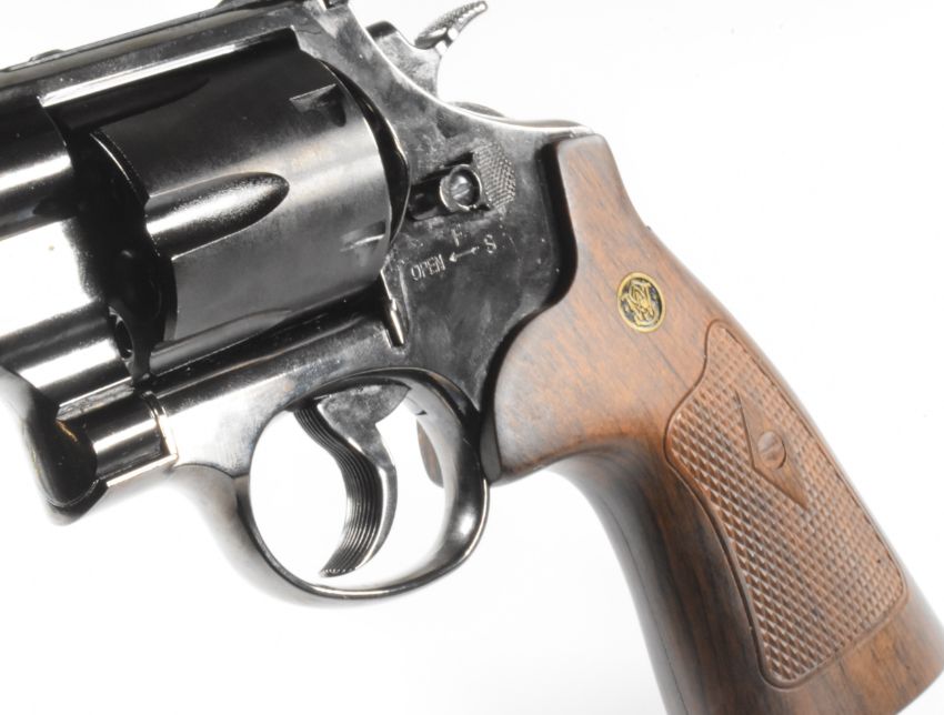 Umarex Smith & Wesson Model 29 .177 CO2 air pistol / revolver with monogrammed faux wooden grips and adjustable sights, serial number D22E040236, in original box with related paperwork.  PLEASE NOTE:- Before bidding please ensure that you are fully aware of any law regarding ownership and of any limitations on shipping of this item