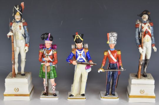 Capodimonte / Naples / Sitzendorf nine porcelain figures of 19thC soldiers including 11th Highland Regiment, Coldstream Guards, Light Infantry, Grenadier Hollandais, Portedrapeau, Standard Bearer etc, tallest 31cm