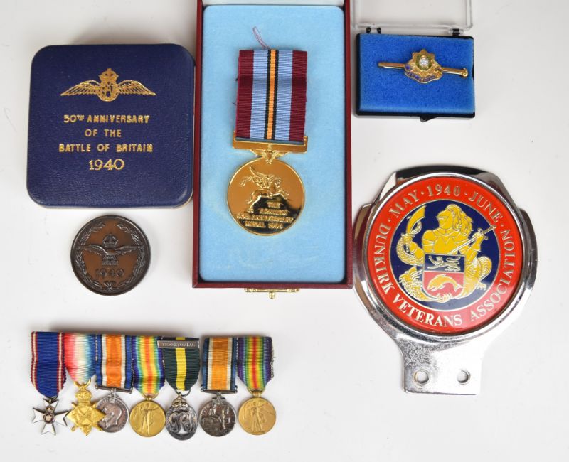 Group of five miniature medals comprising MVO, 1914/1915 Star, War Medal, Victory Medal and Territorial Decoration, miniature WW1 pair, East Yorkshire Regiment tie pin, Dunkirk Veterans Association car badge, 50th Anniversary Battle of Britain coin and 50th Anniversary Arnhem medal