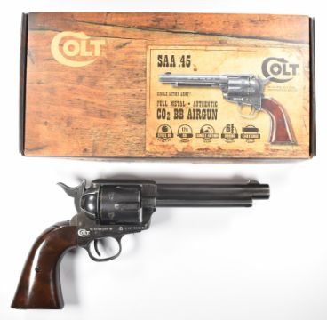 Umarex Colt SAA .45 Single Action Army .177 CO2 air pistol / revolver with faux wood grips, serial number 21K180248, in original box with instruction manual.  PLEASE NOTE:- Before bidding please ensure that you are fully aware of any law regarding ownership and of any limitations on shipping of this item