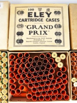Three boxes of primed empty shotgun cartridge cases comprising Parsons of Norwich CS Rosson & Co Vipax 12 bore, Eley-Kynoch 20 bore and Eley Grand Prix.  PLEASE NOTE:- We are not able to offer our usual postage service for this lot