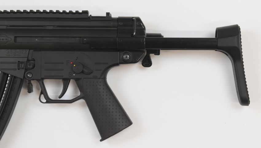 German Sport Guns (GSG) 522 .22 semi-automatic assault style rifle with textured pistol grip, tactical stock, three curved multi-shot magazines, rotary drum magazine, scope rail, sound moderator and 19 inch barrel, serial number A703226, in hard carry case with related paperwork. PLEASE NOTE THAT A VALID RELEVANT FIREARMS/SHOTGUN CERTIFICATE IS REQUIRED TO HANDLE/PURCHASE THIS ITEM.
