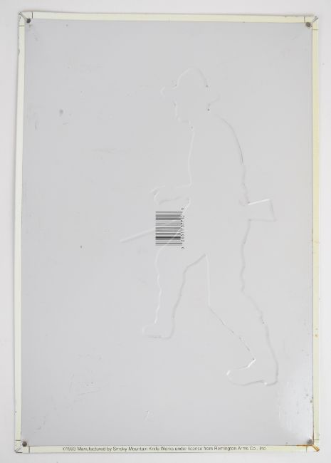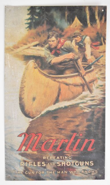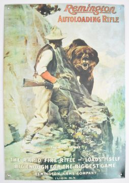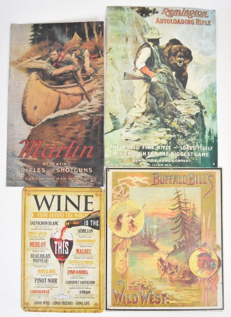 Four metal shop display or advertising signs comprising Remington Autoloading Rifle, Marlin Repeating Rifles and Shotguns, Buffalo Bill's Wild West and Wine From Around The World, largest 40.5x28cm.