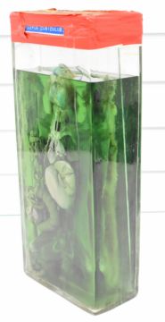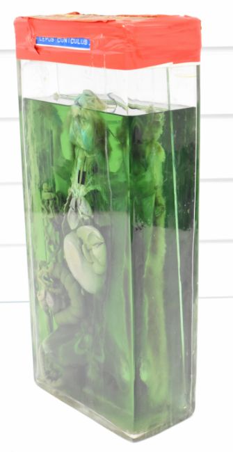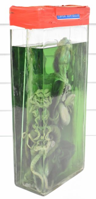 Taxidermy / scientific study of a dissected rabbit in formaldehyde, with label 'Lepus Cuniculus', W20 x D12 x H45cm