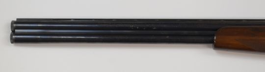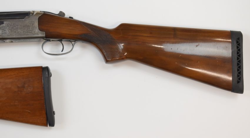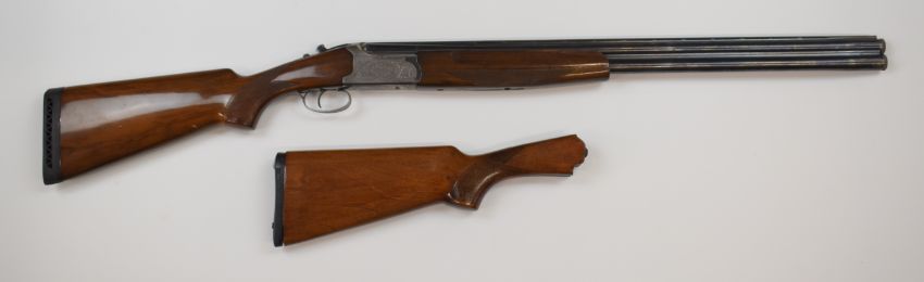 Lanber 12 bore over and under ejector shotgun with engraved lock, underside, trigger guard top plate and thumb lever, chequered semi-pistol grip and forend, single trigger, vented top rib and 27.5 inch multi-choke barrels, overall length 115cm, length of pull 38cm, serial number 217550 together with a spare stock. PLEASE NOTE THAT A VALID RELEVANT FIREARMS/SHOTGUN CERTIFICATE IS REQUIRED TO HANDLE/PURCHASE THIS ITEM.