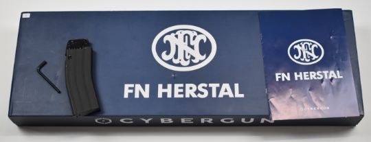 Cybergun FN Herstal US Govenment M4 Carbine .177 assault style air rifle with tactical stock, textured pistol grip, multi-shot magazine and scope rail, serial number E05211103820, in original box with accessories.  PLEASE NOTE:- Before bidding please ensure that you are fully aware of any law regarding ownership and of any limitations on shipping of this item
