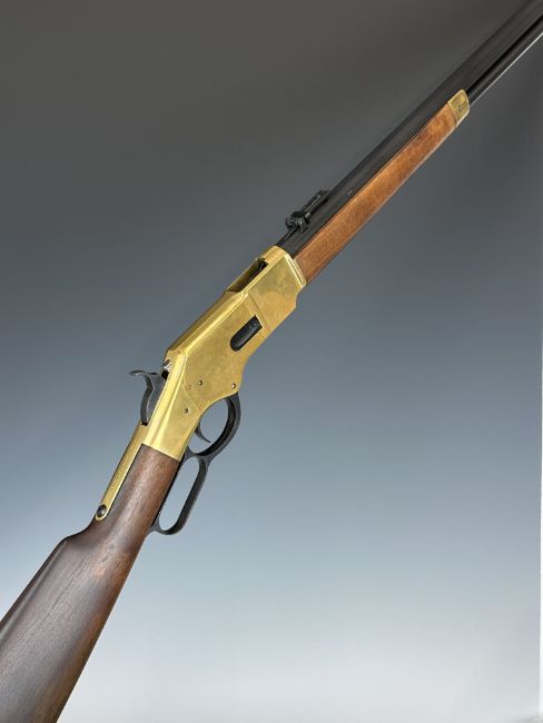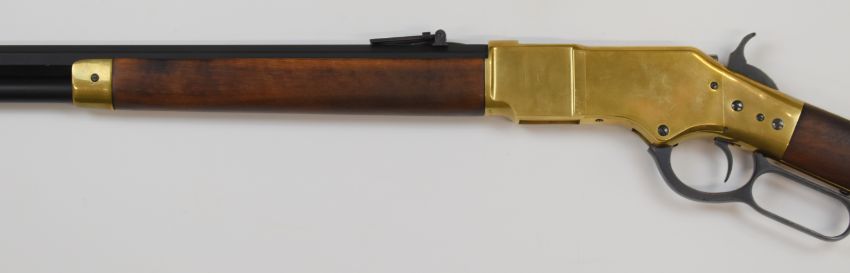 Uberti 'Winchester Henry Yellowboy 1866' Model 66 Sporting .44-40 underlever-action rifle with brass frame and butt plate, adjustable pop-up ladder sights and 24 inch octagonal barrel, overall length 112cm, serial number 41740. PLEASE NOTE THAT A VALID RELEVANT FIREARMS/SHOTGUN CERTIFICATE IS REQUIRED TO HANDLE/PURCHASE THIS ITEM.