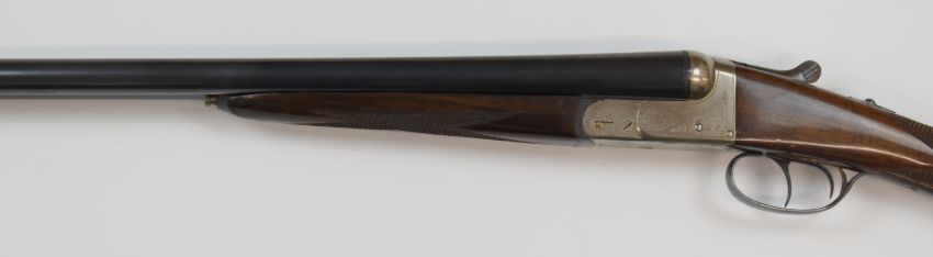 Ugartechea for Parker-Hale 12 bore side by side ejector shotgun with engraved locks, underside, trigger guard, top plate, thumb lever and fences, chequered grip and forend, double trigger and named 27.5 inch barrels choked ¼ and ¾, overall length 113cm, length of pull 36.5cm, serial number 167187. PLEASE NOTE THAT A VALID RELEVANT FIREARMS/SHOTGUN CERTIFICATE IS REQUIRED TO HANDLE/PURCHASE THIS ITEM.