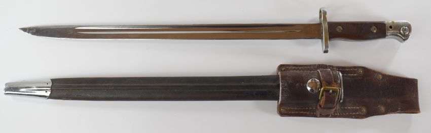 British 1907 pattern Wilkinson bayonet with 43cm chromed blade, scabbard and frog PLEASE NOTE:- Before bidding please ensure that you are fully aware of any law regarding ownership and of any limitations on shipping of this item