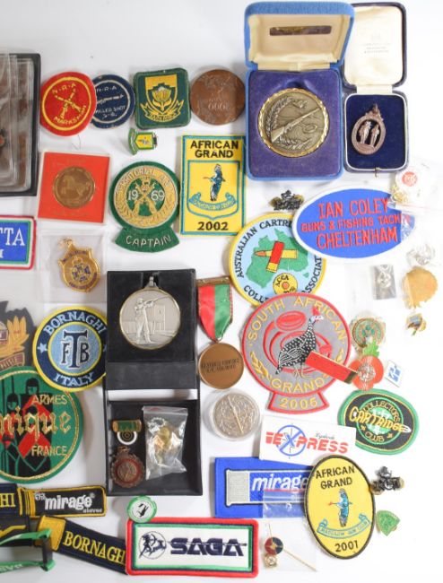 A collection of gun and shooting related badges, patches and medals including Gloucestershire Regiment blazer badge, Territorial Army Captain, Ruger, Victory, XV World Jamboree Mondial, Bornachi, Maccauw Gun Club, Eley Cartridges, Ian Coley, South African Grand 2005, Hull, Collectors Cartridge Club etc.