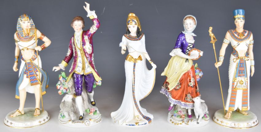Royal Doulton, Wedgwood, Sitzendorf and Coalport Egyptian / Cleopatra figurines, tallest 22cm