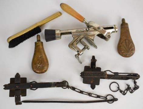 Two vintage animal traps, one a 'Plumb Bob' and two copper shot flasks etc