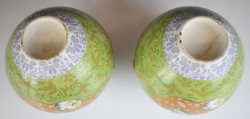 Pair of 19thC vases on stands with Chinese enamelled and relief moulded decoration, height on stands 22cm