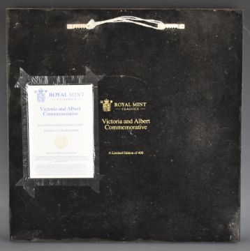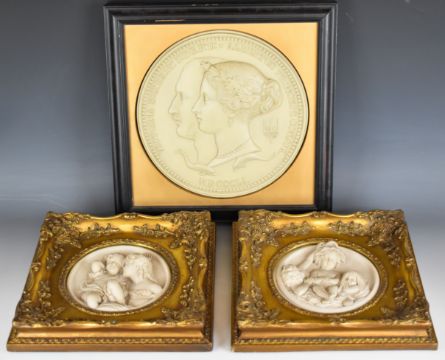 Royal Mint limited edition of 400 framed plaque 'Victoria and Albert Commemorative' and two other classical style framed plaques, largest diameter 30cm