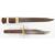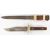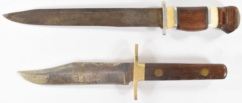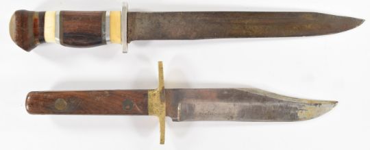 William Rodgers 'Bowie' hunting knife with 14.5cm blade and sheath, together with another hunting knife with sectional handle, 20cm blade and sheath. PLEASE NOTE:- Before bidding please ensure that you are fully aware of any law regarding ownership and of any limitations on shipping of this item