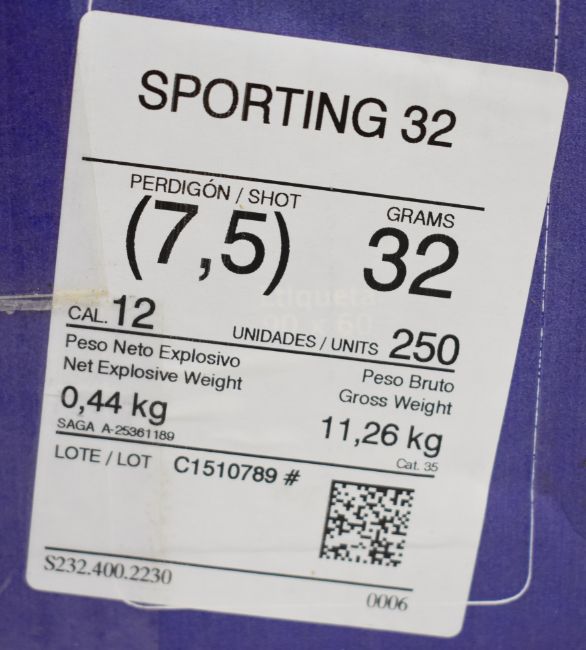 Two hundred and fifty 12 bore Saga Sporting 32g 7.5 shot cartridges, all sealed in original boxes. PLEASE NOTE THAT A VALID RELEVANT FIREARMS/SHOTGUN CERTIFICATE IS REQUIRED TO HANDLE/PURCHASE THIS ITEM. We are not able to offer our usual postage service for this lot