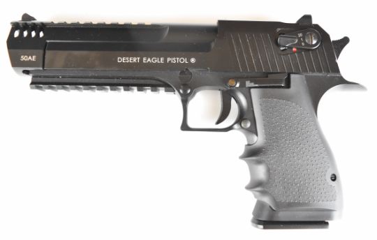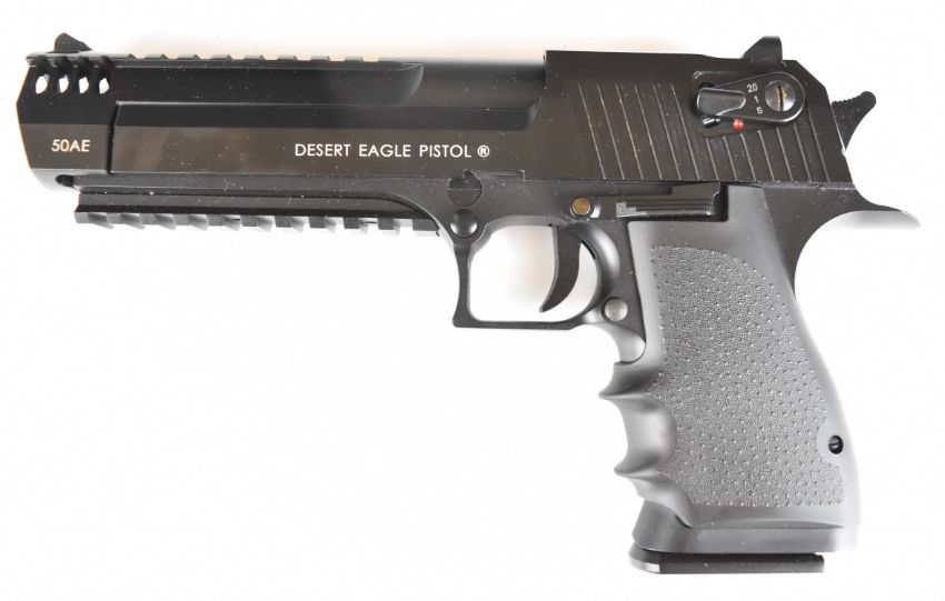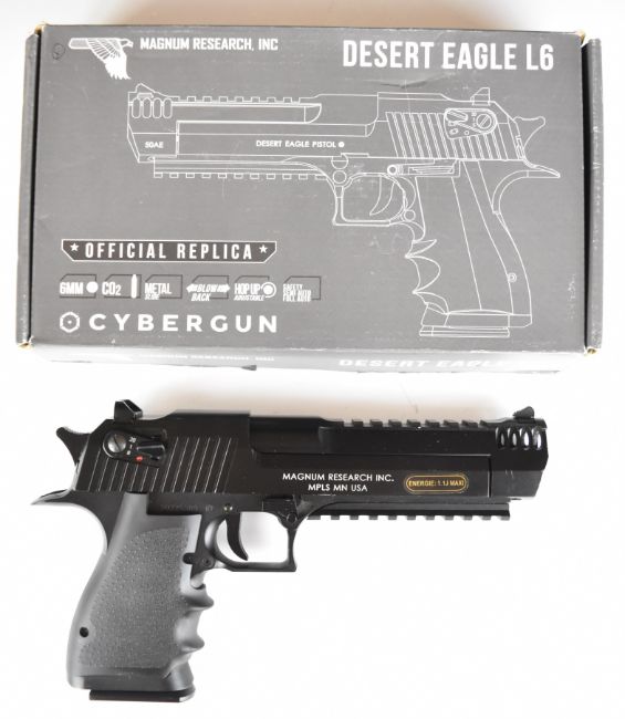 Cybergun Magnum Research Desert Eagle 6mm CO2 airsoft pistol with textured grips, multi-shot magazine and fixed sights, serial number 21915455, in original box with instructions and accessories.  PLEASE NOTE:- Before bidding please ensure that you are fully aware of any law regarding ownership and of any limitations on shipping of this item