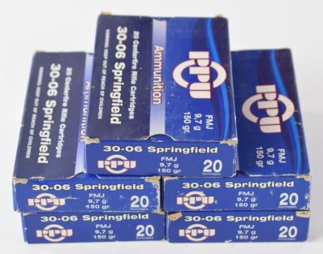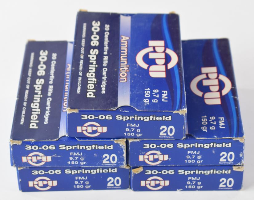 One hundred .30-06 Springfield PPU FMJ 9.7g 150gr rifle cartridges, all in original boxes. PLEASE NOTE THAT A VALID RELEVANT FIREARMS/SHOTGUN CERTIFICATE IS REQUIRED TO HANDLE/PURCHASE THIS ITEM. We are not able to offer our usual postage service for this lot