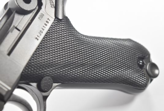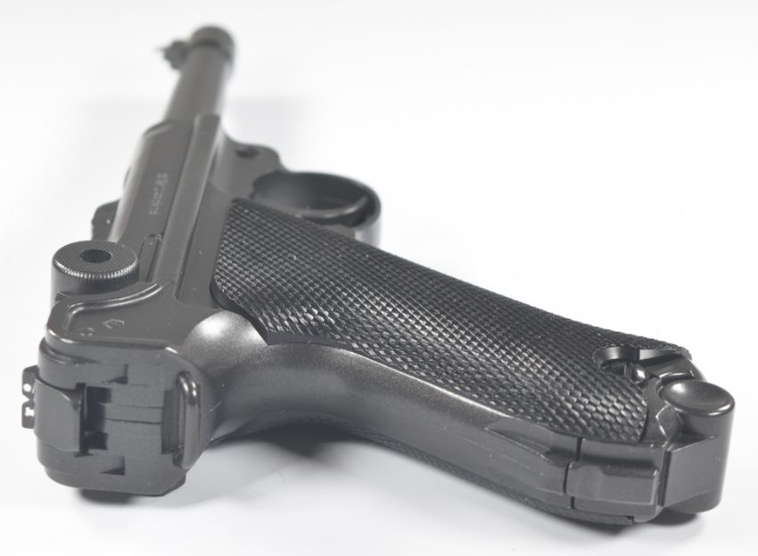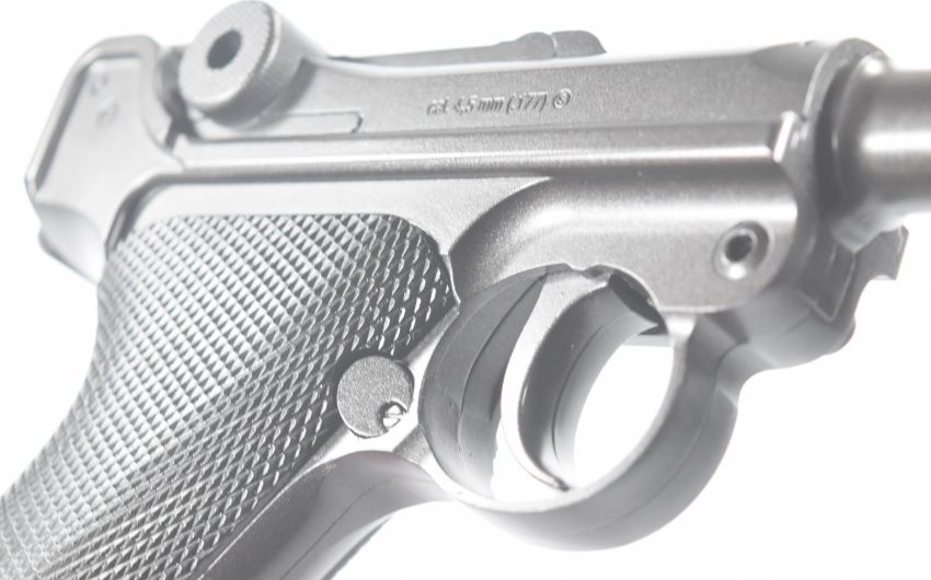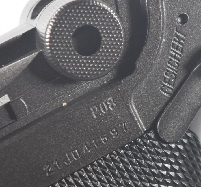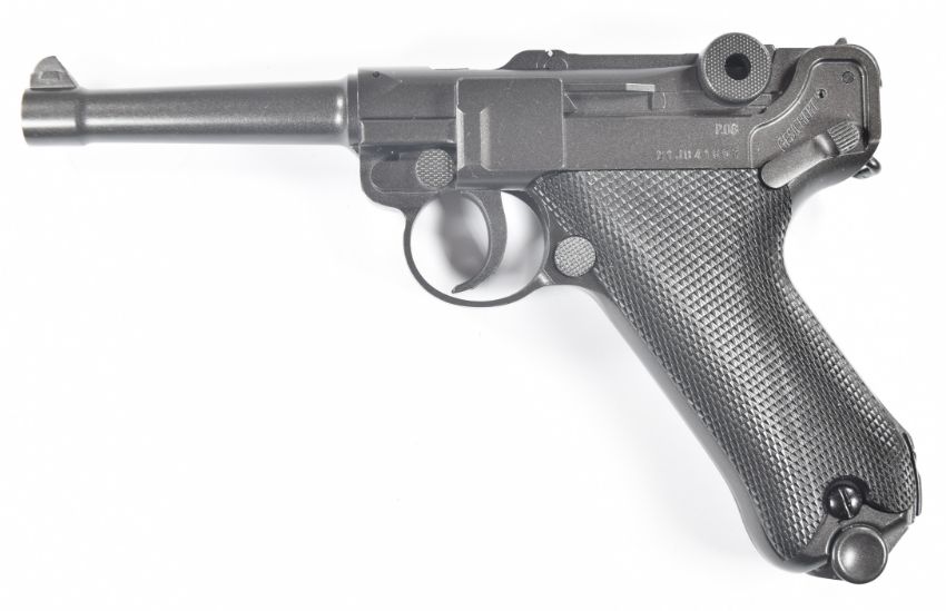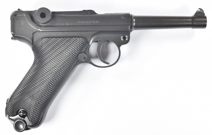 Umarex The Spirit of Legends P.08 Luger style .177 CO2 air pistol with chequered grips, serial number 21J041697, in original box, with instruction manual.  PLEASE NOTE:- Before bidding please ensure that you are fully aware of any law regarding ownership and of any limitations on shipping of this item