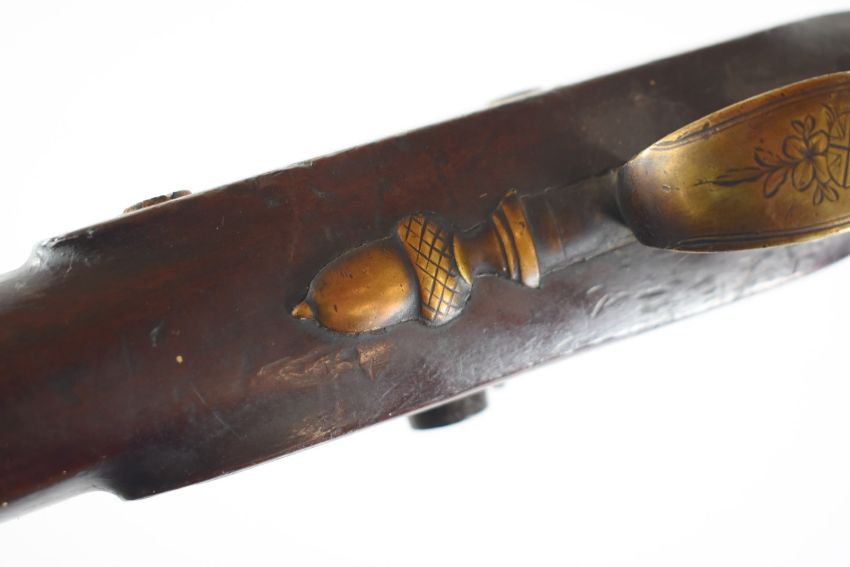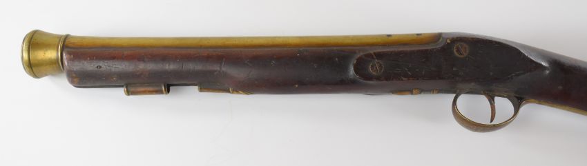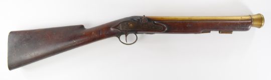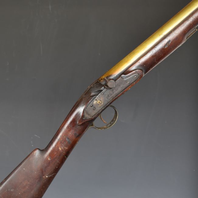 Brasher of London percussion converted from flintlock blunderbuss with named and engraved lock, brass trigger guard and butt plate and 14 inch brass barrel, overall length 66.5cm.